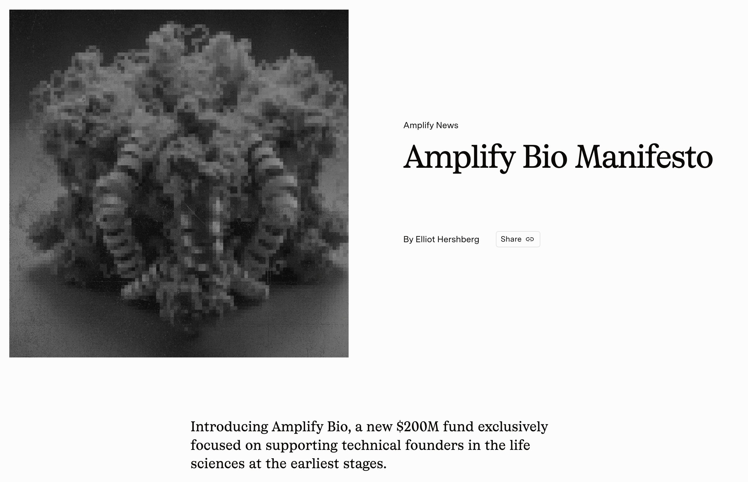 In the Weekly Dose, we often cover breakthroughs in biotech. In the past month alone, we’ve covered multiple miraculous gene therapy breakthroughs. At the same time, it’s been a weird market for investing in biotech companies. Elliot believes and has written many, many words on the idea that this is going to be the Century of Biology. As he writes in the Amplify Bio Manifesto, bio is at the same place tech startups were almost two decades ago, with the infrastructure in place to take really big swings: “Equipped with rented lab benches, cheap cloud compute, and tremendous grit, we believe these brilliant technical founders have the potential to build generational companies.”