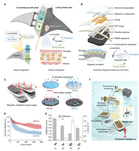 Researchers cracked that by building a manta ray–style soft robot whose own magnetic field both propels it and keeps its flexible zinc-manganese batteries stable, nearly doubling their capacity retention. External magnetic fields push and pull the robot’s magnetized body, creating the forces and torques that make it swim, while the same fields protect its batteries so power keeps flowing as it moves. The result is a robot that can roam untethered for hours, sensing and reacting to its environment, whether underwater or in narrow passages, in real time. It’s a blueprint for soft robots that can explore hard-to-reach places, assist in medical procedures, or power next-generation wearables without being tied to a cord.