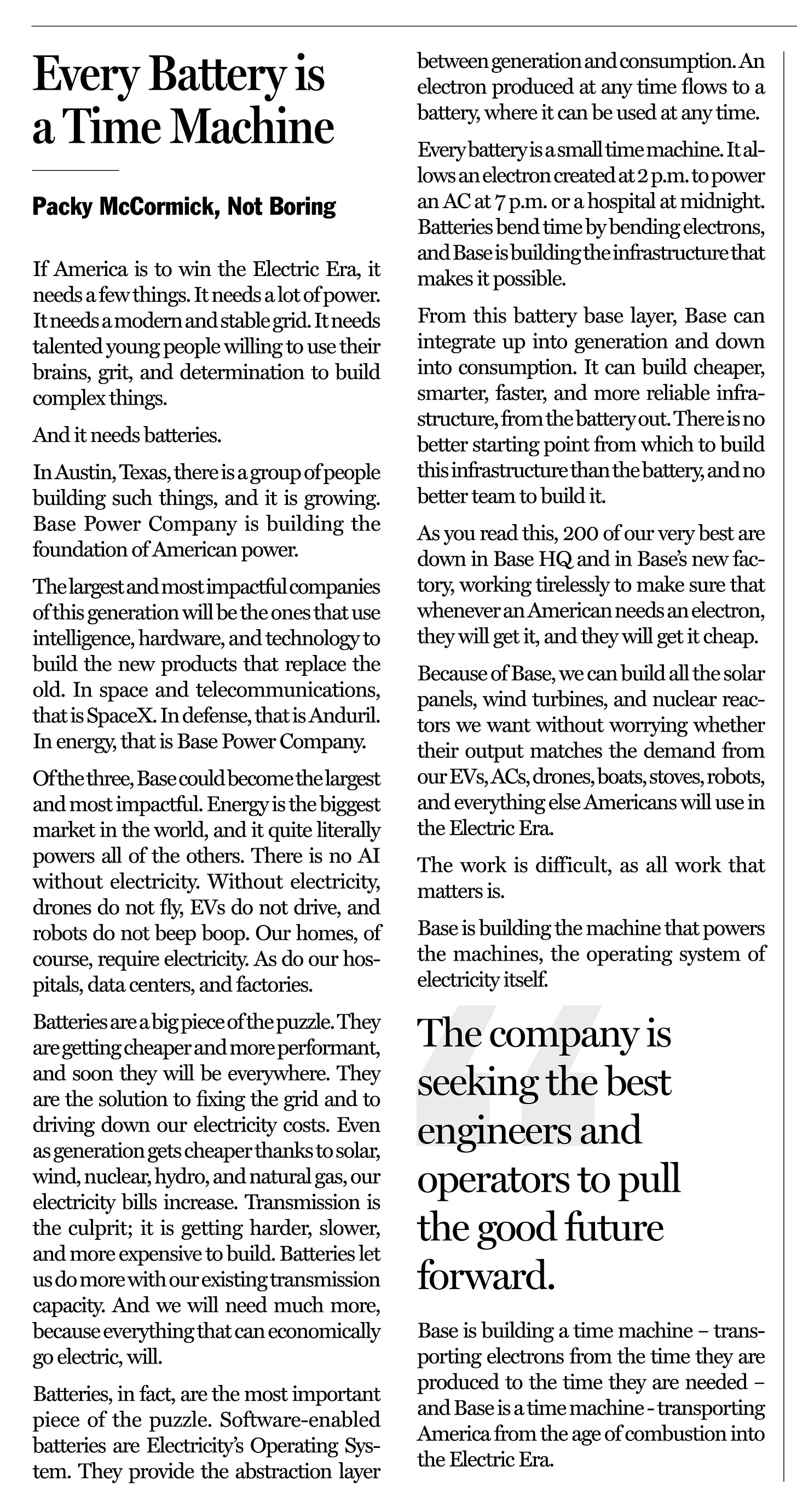 To share the news, and celebrate the launch of their factory in an old newspaper building, they released a newspaper, The Base American. I contributed an article on why batteries are crucial to fixing the grid and securing our electric future.