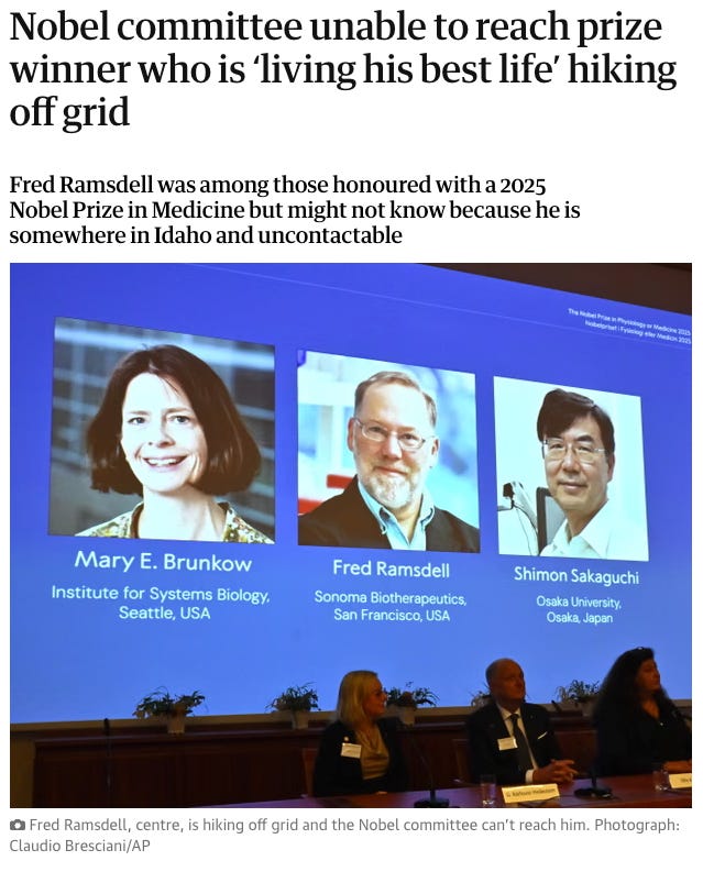 The Nobel committee has been unable to reach a winner of this year’s prize for medicine, who is “living his best life” on an “off the grid” hiking foray, a spokesperson from his San Francisco-based lab, Sonoma Biotherapeutics, has said.