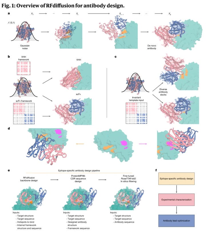 A research team led by Nathaniel Bennett and David Baker from the Institute for Protein Design at University of Washington developed RFdiffusion, an diffusion-based AI model capable of designing full-length antibodies de novo (directly in silico (in the computer)) tailored to bind specified epitopes (the specific part of an antigen that an antibody or T-cell receptor binds to during an immune response) with atomic accuracy.