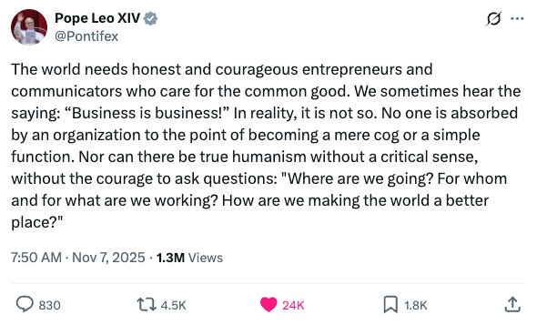 Pope Leo XIV, the American Pope, the Villanova University graduate, the White Sox fan, blessed the timeline with a number of tech-related tweets this week, including this one, which asks entrepreneurs to ask, “How are we making the world a better place?”