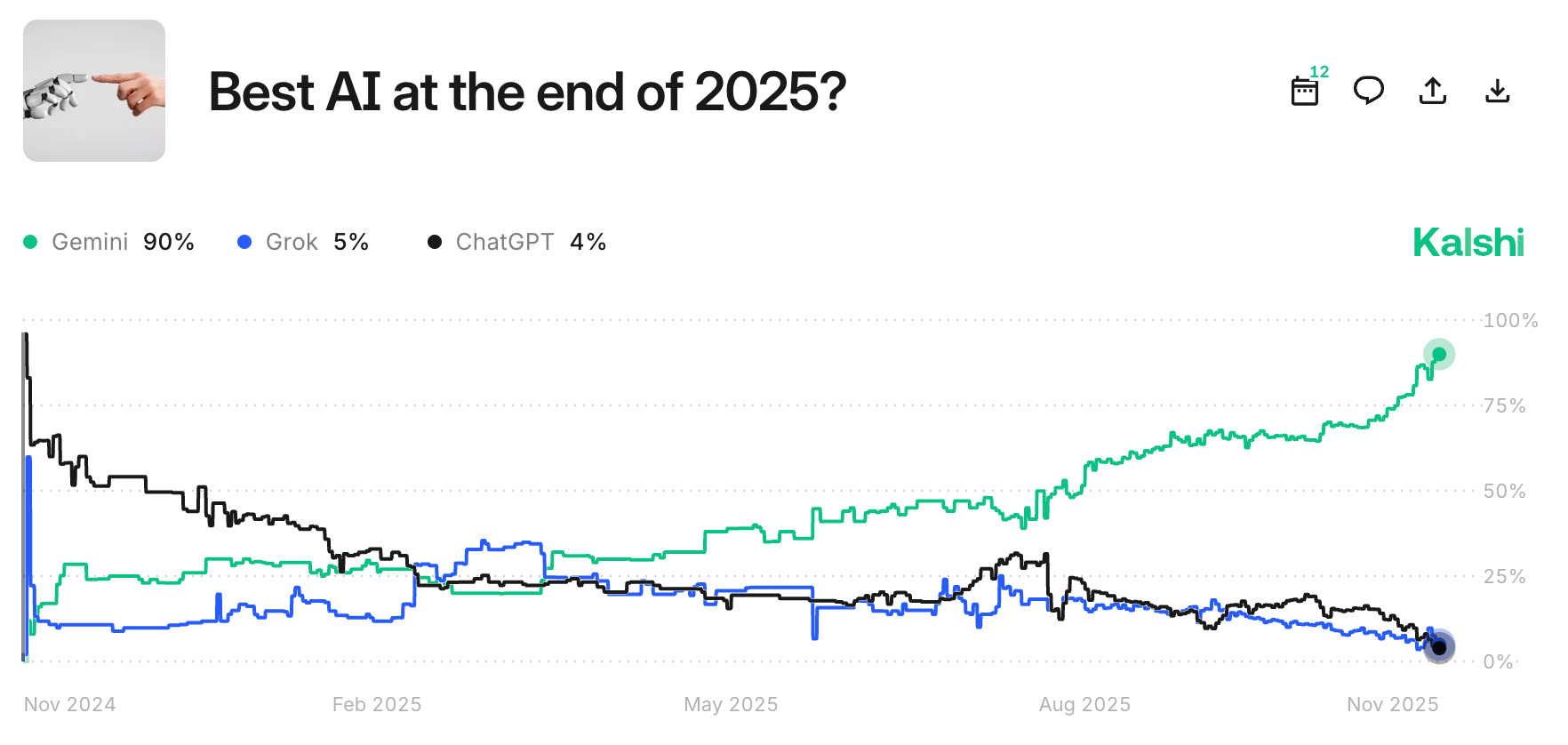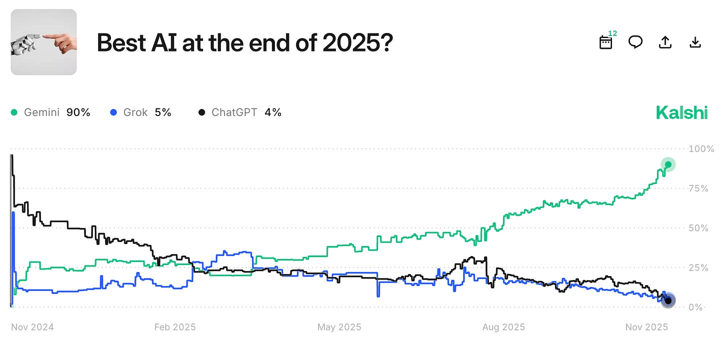 Google DeepMind released its newest model, Gemini 3, this week and blew everyone out of the water. GDM’s odds of having the best AI model at the end of the year jumped to 90% on Kalshi, ahead of Grok then Open AI.