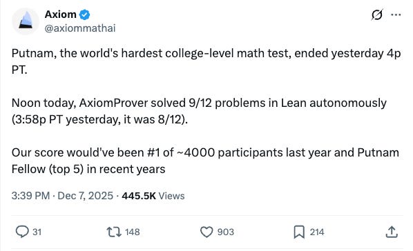 Not wasting my precious time getting really good at math was the real genius solution all along, because this week, Axiom, a 4-month-old startup that recently bought its first couch, beat 99.9% of the humans smart enough to even take the Putnam Exam in the first place.
