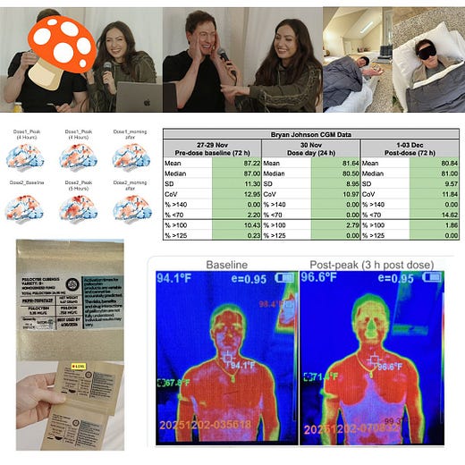 Bryan Johnson, the man who plans to not die and is willing to run experiments on himself in service of that mission, recently ran (and livestreamed!) two self-experiments with large doses of psilocybin. Took the internet by storm. It was fun, he was in love, and he had a hunch that mushrooms might be a useful tool in his quest for the fountain of youth.