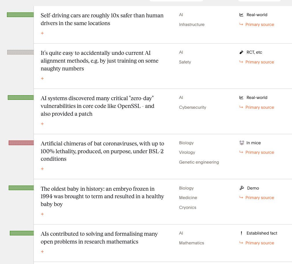 By that scoring method, the development with the highest expected value (P(generalizes) x big | true) is Waymo’s finding that self-driving cars are 10x safer than human drivers. The lowest expected value, but most fun, goes to “Can I run DOOM on my soup?”, a “Theoretical demonstration of the Turing completeness of certain exotic flows of fluid. This direction is part of Terry Tao’s proposed strategy for solving the Navier-Stokes Millennium Problem.”