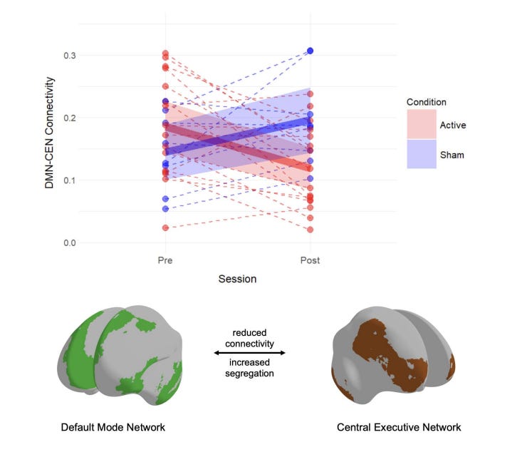 After two weeks, the active group's brains showed the decoupled network pattern that normally takes experienced meditators hundreds of hours to develop (p < 0.001). The sham group's connectivity actually increased; they got more tangled up, not less, which is exactly what frustrated novices do. Within the active group, greater decoupling also predicted bigger increases in self-reported acceptance and longer voluntary meditation sessions. The ultrasound made the practice better and gave novices experienced meditator brains.