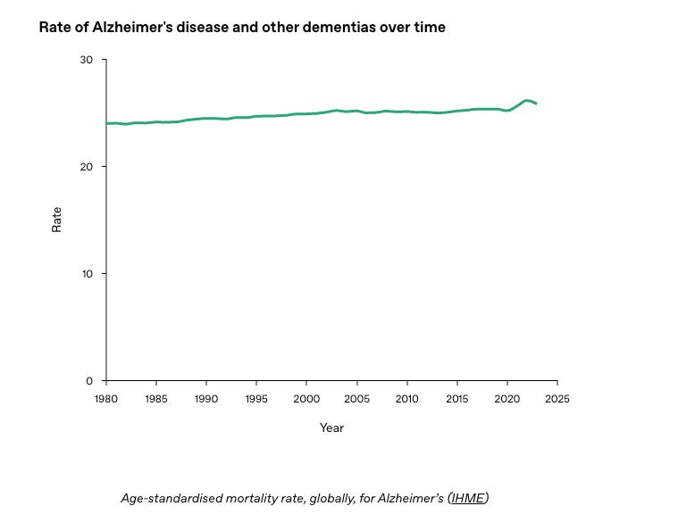 My grandmother had Alzheimer’s. One of my biggest fears in life is that me and the people I love will get it; it’s one of the reasons I started writing, to help me remember. Unfortunately, since my grandmother had it, we’ve made no progress on defeating Alzheimer’s. Measured by age-standardized mortality rate, while we’ve made strides against cardiovascular disease, cancer, and infectious diseases, Alzeheimer’s has only gotten worse. It is a complex disease with hundreds of environmental and genetic risk factors interacting across cell types over decades, and as such, treating it has been a sad game of whack-a-mole.