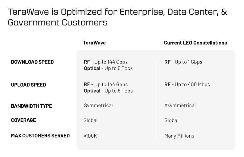 TeraWave is targeting ~100,000 enterprise, data center, and government customers who need redundant, high-capacity connectivity where fiber is too slow, too expensive, or impossible to deploy.