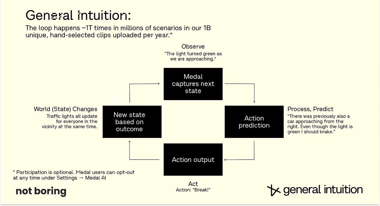 This gives us trillions of examples of players running the loop of observe, predict, and act. This is the foundation of intelligence, and there is no loss of information throughout.