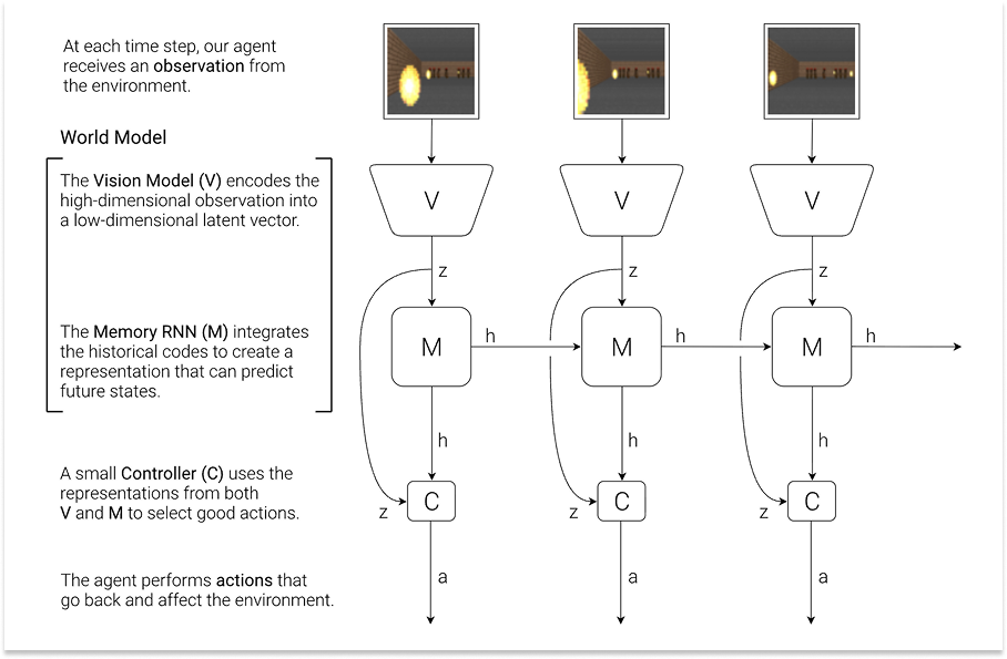 To answer their own question, Ha and Schmidhuber built a fictional system with three components: a vision model (V) that compressed raw pixel observations into a compact representation, a memory model (M), a recurrent neural network that learned to predict what happens next, and a tiny controller (C) that decided what to do based only on V and M’s outputs.
