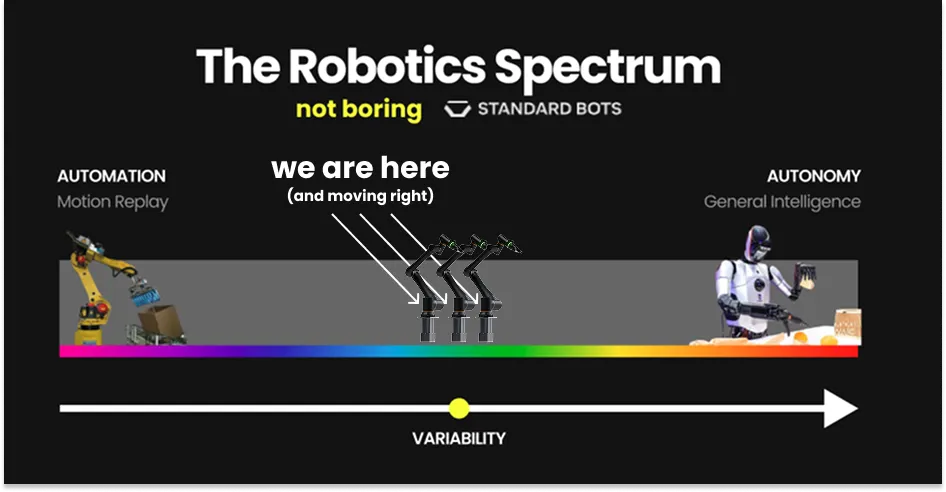 Evan and his company Standard Bots are pursuing the small step approach: getting paid to learn in the field, one use case at a time. They are collecting real-world data for a growing number of economically viable use cases across a wide variety of domains.