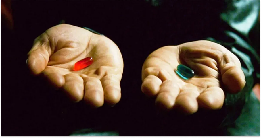 Whether you come with us is up to you. You take the blue pill, the story ends. You wake up in your bed and believe whatever you want to believe. You take the red pill... you stay in Wonderland, and we show you how deep the rabbit hole goes.