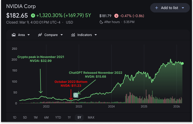 They soon switched to ASICs, but in 2015, Vitalik Buterin and his team released Ethereum, whose memory-heavy workloads were harder to optimize with ASICs. Ethereum mining ran on GPUs from 2015, through the GPU shortage it caused during the 2020-2022 crypto boom, right up until Ethereum switched from Proof-of-Work to Proof-of-Stake and left a GPU glut in its wake. Crypto tanked anyway, and in the same month crypto peaked, Nvidia’s stock did, too, tumbling 66% over the next year, until OpenAI released ChatGPT and, since then, Nvidia’s market cap has grown 10x to the $4.4 trillion behemoth we know today.