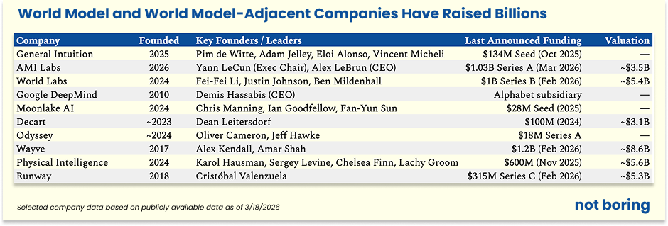 Since that first meeting, the World Models space has heated up. Fei-Fei Li’s World Labs raised $1 billion. Yann LeCun’s AMI raised $1.03 billion. World Models were one of the stars of this week’s NVIDIA GTC. But the field is so nascent and there is so much going on, so many geniuses pursuing competing and collaborative approaches, that it’s hard to make sense of it all.
