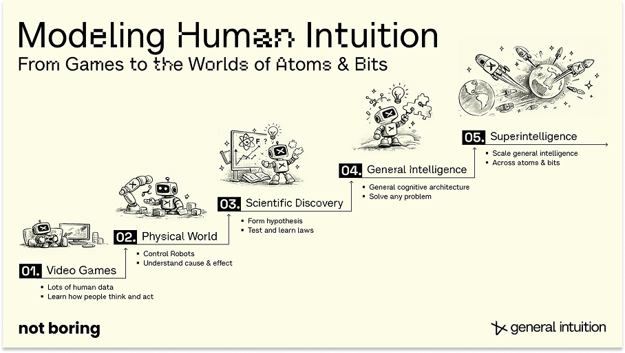 General Intuition and Standard Bots are coming at the same problem from opposite sides of the spectrum. General Intuition is attempting to solve generalization from the digital side: our bet is that gaming data will lead to broad priors about physics and actions. Standard Bots is attempting to solve generalization from the physical side: their bet is that real-world deployments will lead to broad priors about manipulation and industrial tasks.